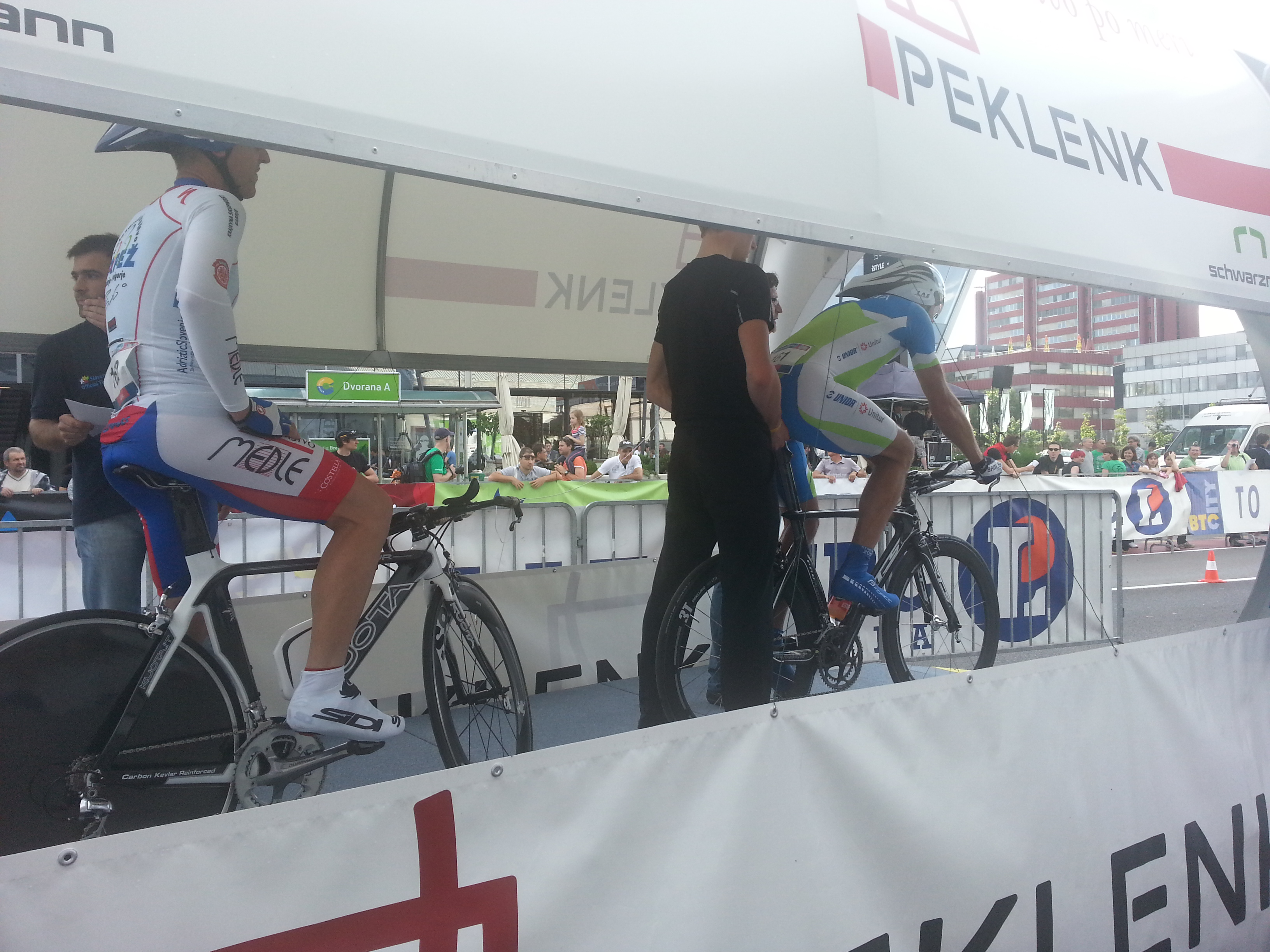 Danes je bila dirka na kronometer. Opazoval sem od mlajših deklet do starejših atov. SO bili kar pravi carji. In zadeva je izredno resna. Ogrevanje pred tekmo. Ohladila nas je le hitra nevihta, ki pa je naredila nekaj težav tistim “ta hitrim” (cesta je bila spolzka).