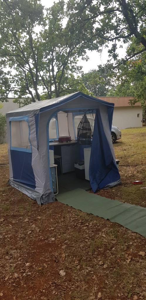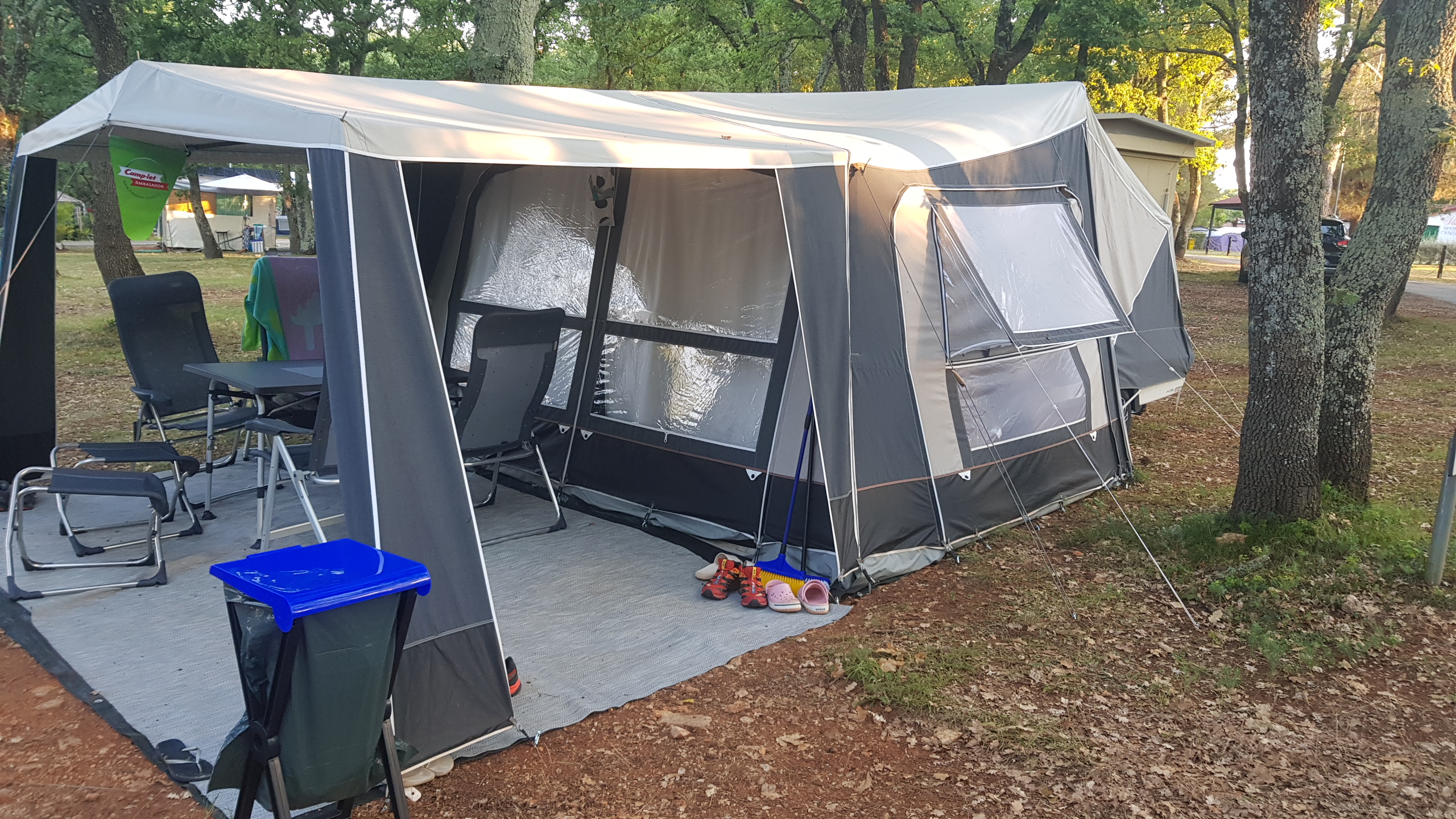 Naša prikolica je bila pripravljena po dveh urah in pol ležernega, počasnega postavljanja. Zložene so bile vse cunje. Vse začimbe so bile na svojem mestu. Tuširanje skorajda ni bilo potrebno saj se nismo niti preznojili. In seveda na koncu sva z ženko hvalila drug drugega, kako sva složna v postavljanju prikolice. In kako dobro sodelujeva. Res sva čudovit par, ker se nikoli ne skregava med postavljanjem.