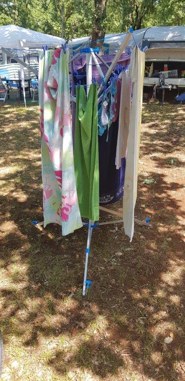 Klini so zabiti prav vsi. Niti enega nisem pozabil. Ob tem sem si ves čas zbijanja ponavljal, da kar jaz postavim nihče drug ne more razstaviti. Mišljeno je predvsem veter ali kako pravo istrsko neurje. Seveda imava pod baldahinom in pod tepihom, na katerem stoji jedilna miza, še zeleno PVC podlogo, da se tepih ali kaj drugega ne umaže. Včasih ob tem razmišljam, da bi s seboj nosil tudi tiste bele bombažne rokavičke, kot jih vidimo v filmih pri butlerjih, da ja ne bi česa umazal. Ob prikolici stoji sušilnik perila, ker taki krasni prikolici pa vrv ne pritiče zraven. Ob prikolici je že v bojni poziciji pripravljen žar, ki prav tako stoji na mizici, ki omogoča reguliranje vseh nogic. Verjetno je odveč povedati, da tudi ta stoji umerjen z waservago.