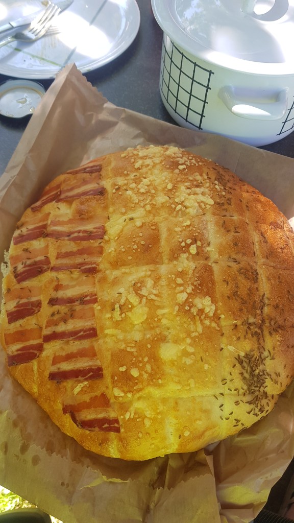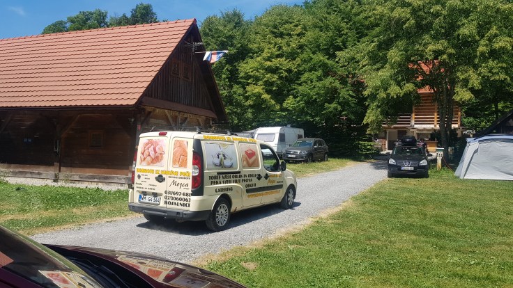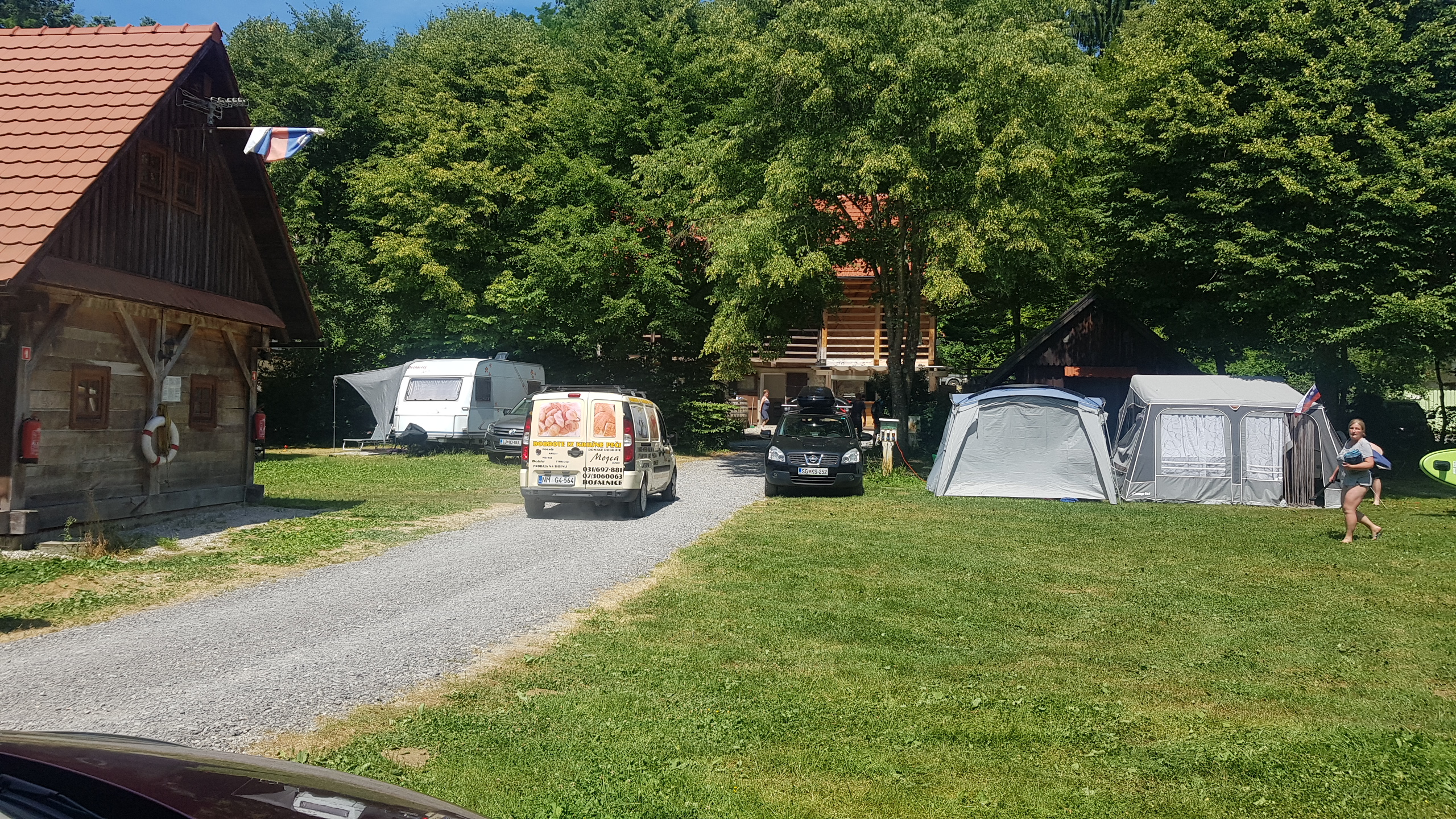 Skoraj bi pozabil. V kampu ni nobene trgovine. Najbližja je 2 km stran v Metliki. Vsako jutro pa v kamp pripelje svež kruh, pogačo in pecivo super pekarica Mojca. Ta iam energije za pet. Prava Belokranjka. Belokranjska pogača sicer ni bila topla. Bila pa je okusna. In prijazno jo je naredila s sirom, špehom in kumino. Zmazali smo jo v trenutku.