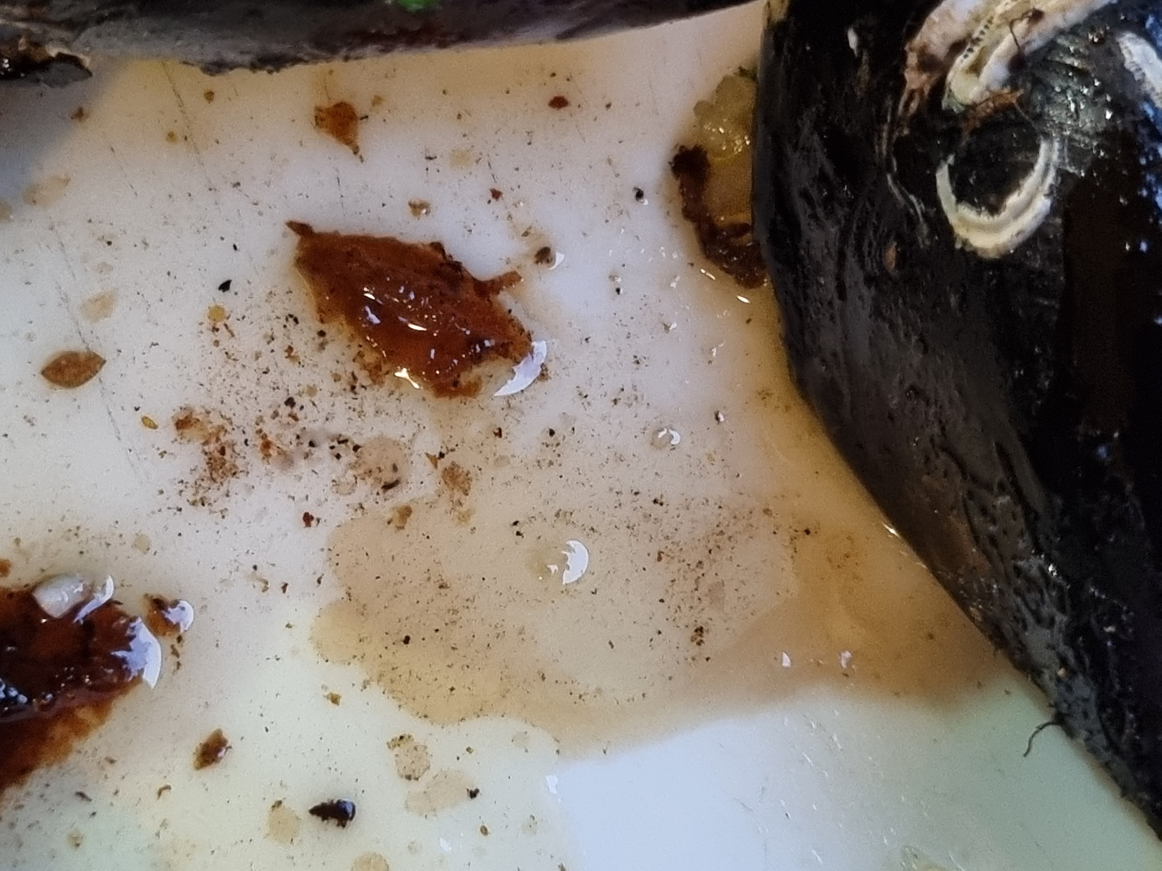 Naročimo nekaj porcij kalamarov, dvoje ocvrtih, eni pečeni in školjke na način buzara. Kalamari slabo očiščeni. Školjke pa… žalost. Slika spodaj prikazuje celotno polovico pljunka buzare. Kruh – trd.