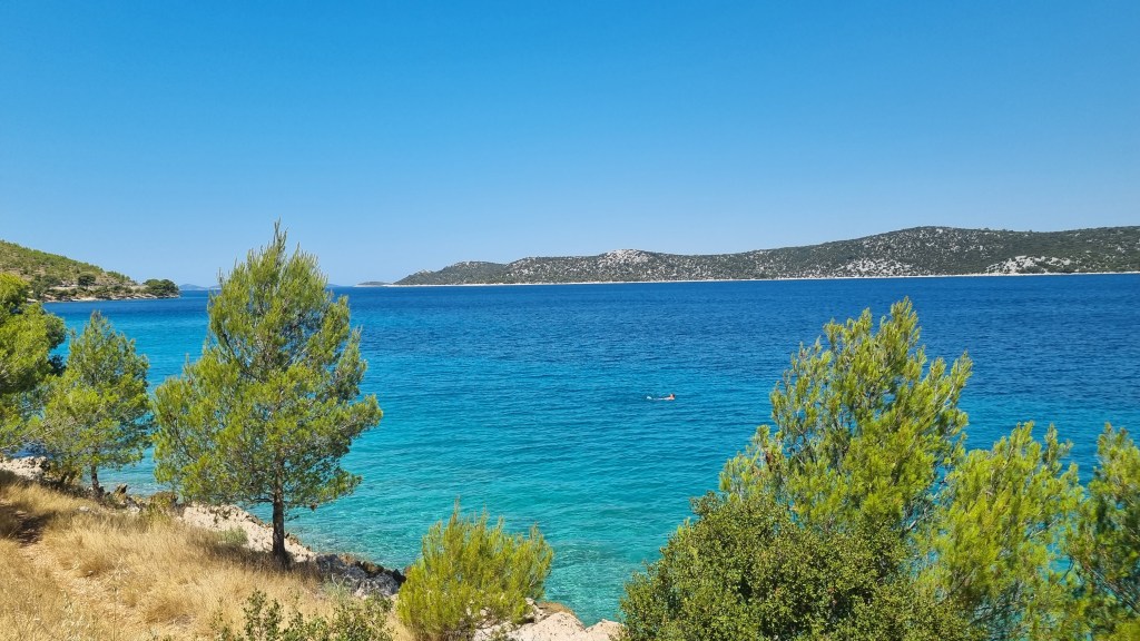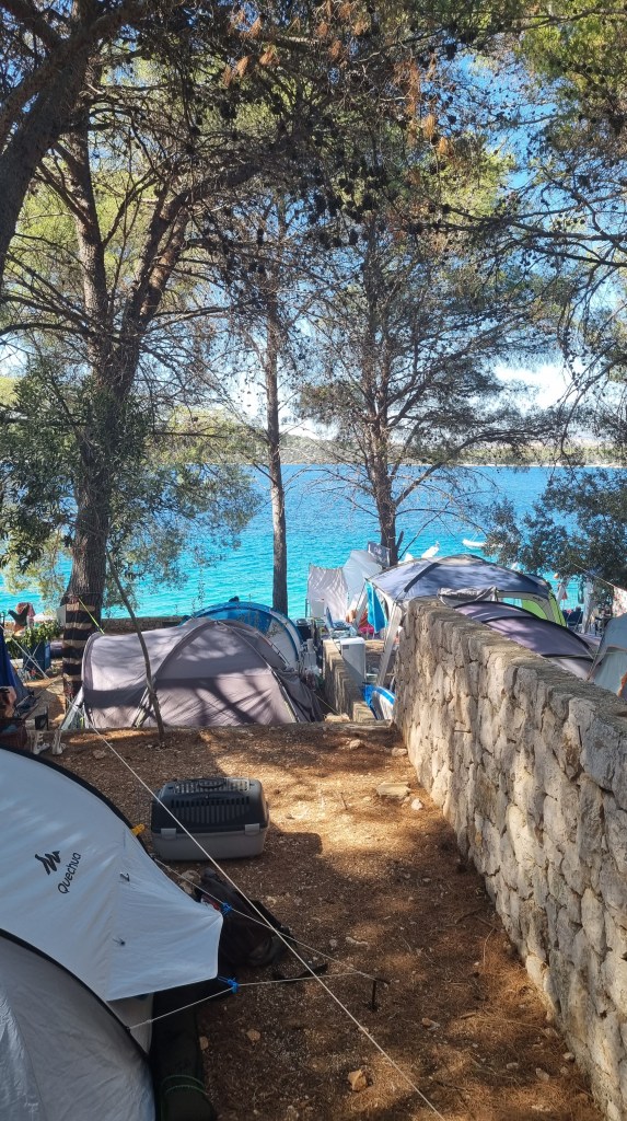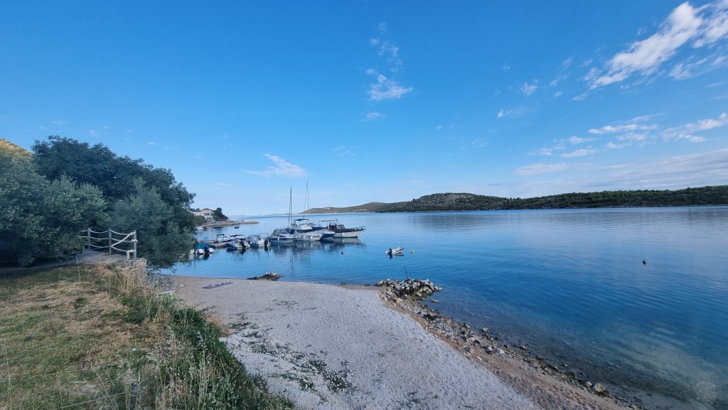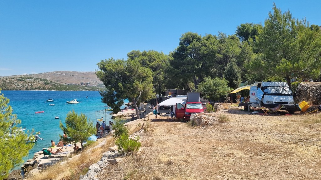 Ampak gremo lepo po vrsti. Dalmacija. Letos smo si zadali, da končno gremo dlje od Krka. In destinacija Dalmacija. Plan je bil, da gremo do Zadra. Tam najdemo kamp, se ustalimo in to je to. Brez rezervacije. Tako kot se gre na dopust. Sicer me je bilo malo strah, ampak vseeno. Saj bomo dobili. S kolegom Polancem je bil dogovor, da gremo skupaj do Zadra. Tam gre on naprej proti Primoštenu, mi pa na Zadar. Situacija se je spremenila. Skupaj gremo proti Primoštenu in pristanemo v kampu Tomas med Šibenikom in Primoštenom. Kamp je nekoliko robinzonovski. Topla voda je na voljo toliko kot jo segreje sonce. WC prostori so stari a čisti. Vse ok. Kamp večinoma v senci. Kamp obogaten z lokalom. Špricerja ne priporočam – zanič (vsaj meni). To je vse. Nobenega dodatnega luksuza. Skratka lahko bi rekel, da smo začeli s prvinskim kampiranjem. Kamp Tomas ne ponuja kaj dosti. Ponuja prostor za kampiranje, ponuja krasno vodo (za kopanje), ponuja vodo za tuširanje, če imaš srečo celo toplo. Za pomivanje tople vode ni, razen, če jo pogreješ na indukcijski ali drugi plošči. Ob vstopu v vodo je potrebno paziti, da se ne nagradiš s tem, da stopiš na ježa. Voda je hitro globoka. Ampak reeeees čista.